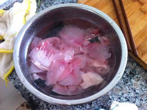 鱼去皮改刀切鱼片加水浸泡一小时,沥干水分后加蛋清、料酒和盐抓匀腌制