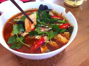 锅内放少许油入一部分蒜泥、花椒、生姜、辣椒炒出香味,放一大勺豆瓣酱继续翻炒后加入鱼骨高汤略煮加入木耳金针菇提鲜,加入生抽调味,滚开之后改中火下鱼片,鱼片变色立即关火出锅,将剩余辛香料撒上热油呛一下放上香菜装饰就完成了