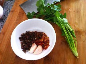 葱姜切片,香菜切段,蒜拍扁切末。 锅中烧水水开放干辣椒,花椒和麻椒/青椒煮一下去灰尘,后面炸不会糊(忘拍了,两部加一起)