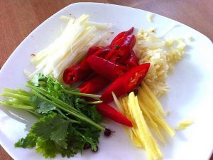 鱼片入盆后,放上香菜。跑滚油,滚油时注意干辣椒的颜色。撒上葱就可以了。