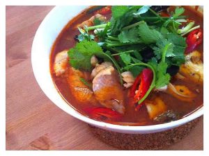 锅中倒油油热放葱姜和少许煮好的辣椒花椒煸炒在放火锅底料,底料化后倒入少许料酒酱油再倒入清水