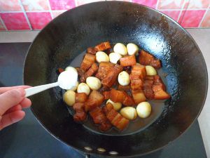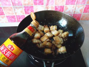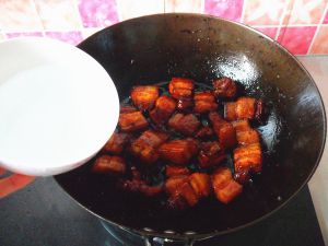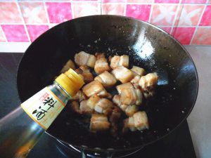 煸炒至冰糖融化,五花肉发黄时加入2汤匙料酒。