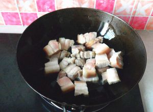 五花肉切块,2-4cm块都要有,因为大小块口感不同。锅里放底油,放入肉块,抄到肉里面最小肉块油出尽为止。这是重点,一定要油出尽,把油撇出放到碗里,这是猪油做其他菜可以用。