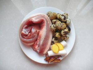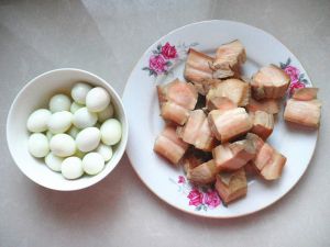 将鹌鹑蛋煮熟去壳,五花肉切成3厘米大小的块。