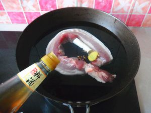 五花肉放入冷水锅中,加入姜片、料酒,水开后再煮5分钟,然后捞出洗净血末。