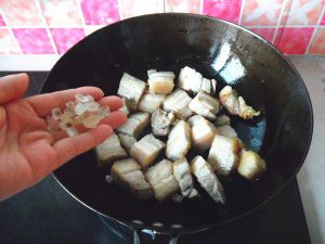 炒至五花肉微微发黄时放入冰糖继续煸炒。