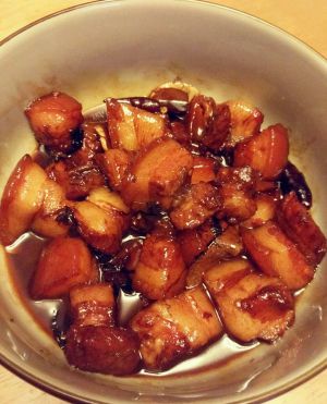 中间忘记拍照了:(! 下油爆香配料,下肉一起炒香至表面金黄,然后捞起备用。洗锅 下油炒糖,慢火 炒至金黄,下肉 炒至表面着色均匀 然后放 料酒 老抽 盐 热水(刚盖过表面)慢火闷1小时,肉的油腻感都会跑掉 剩下香甜软糯的口感。最后的十分钟是调味的最佳时机,咸香随人,可以适当增加老抽或者糖的分量,然后等肉自然收汁。