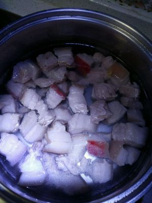 五花肉切块洗净,加入葱姜放入冷水煮沸。将肉以热水洗净擦干