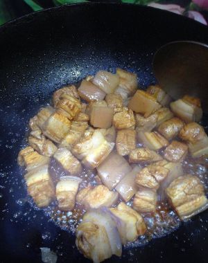 加入适量的油,加入冰糖。待冰糖化成棕色,加入肉。