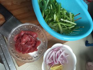 牛肉切薄片,清水里浸泡十来分钟,去除血水
