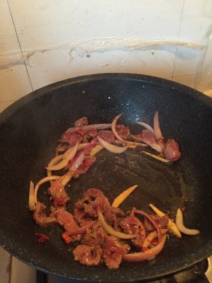 锅里加油后先爆炒洋葱丝和姜丝及干辣椒,炒香后放入牛肉片,大火炒散,稍变色加点生抽就关火盛出。