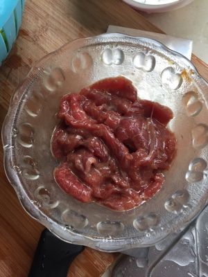 牛肉切片后先用盐捏下,之后加2茶勺料酒和4茶勺蚝油抓匀,再撒一点红薯淀粉包裹住肉汁。