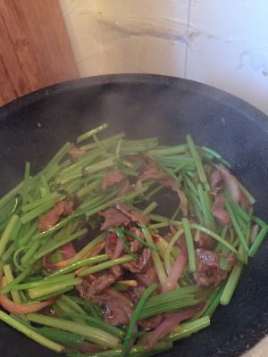 锅中倒油,放入葱丝、姜丝、蚝油爆香,放入腌好的牛肉翻炒。
