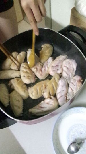 然后锅中放少量油,煎至鸡翅表皮金黄色。