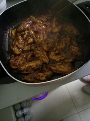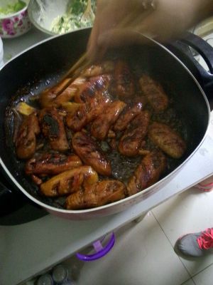 葱姜变色倒入百事可乐、漠过鸡翅即可,中火煮20分钟,期间翻炒鸡翅。再次放入老抽、醋,砂糖适量。