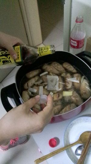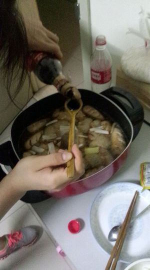 放入一小块姜,一个八角,然后倒入可乐,还有少量酱油,盖上锅盖,大火收汁