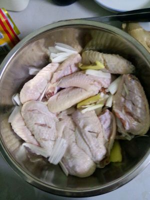 鸡翅洗净在表面切几个口子,放少量姜片和葱段,加料酒腌制。