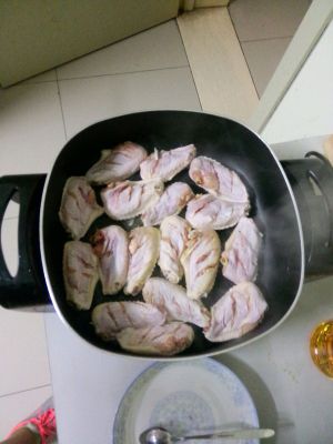 鸡翅洗后沥干,锅里放少许油,不放油也行,将鸡翅煎直两面黄