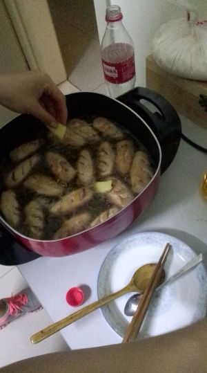 锅中倒入油,油四成热时放入腌好的鸡翅中,一定要小火,不停翻炒,避免糊掉,煎至金黄有嘎时把多余的油撇掉,因为鸡翅本身逼出油会太油腻。可以多煎一会。