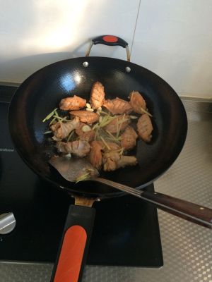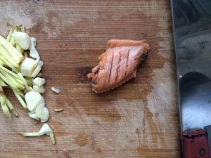 鸡翅煎差不多时,入姜丝和蒜头翻炒