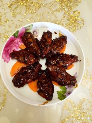 酱汁快要收干也就是大概二十多分钟后关火,鸡翅一个个夹出来摆盘葱姜挑掉最后把酱汁浇上去