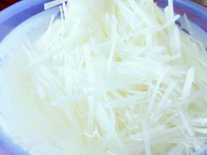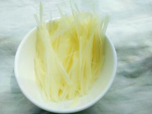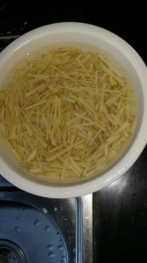 切好的土豆丝在清水里泡着,一定要全部浸入水。