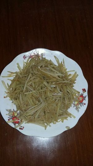 开火油热放姜丝炒一下倒入土豆丝大火翻炒放入佐料再炒一下出锅。p