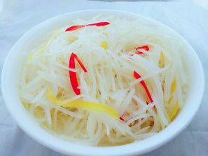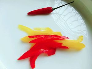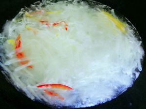最后放入红辣椒丝,花椒油,香油和适量的醋、盐搅拌均匀即可。
