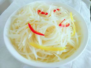 土豆捞起后冲冷水冷切,倒盘加盐,醋,加小米椒拌好即可