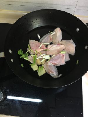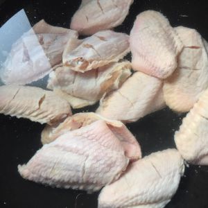 锅内装水烧开,倒入少许料酒,放入鸡翅,焯烫五分钟,捞出过凉。
