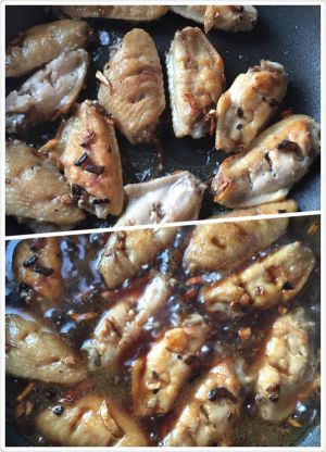 锅内倒入少许油,稍热,将鸡翅摆入,小火煎炸表面变色。