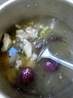 将排骨汤倒入电高压锅滴上几滴香醋,按煮肉键炖20分钟