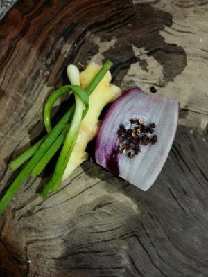 蒜切厚片,生姜切片,八角,桂皮,红辣椒,花椒准备好