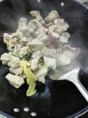 冷水下锅焯下排骨去血沫。锅里倒入少许底油葱姜爆香倒入排骨翻炒片刻。