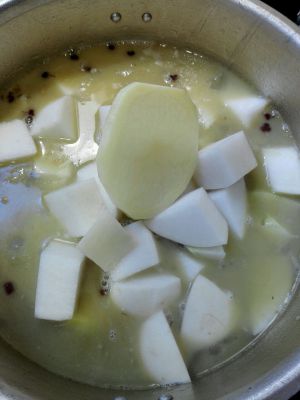 炖20分钟后,加入白萝卜土豆,继续炖至食材软熟