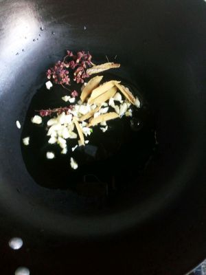 油锅内放入蒜沫 姜丝 花椒炒出香味