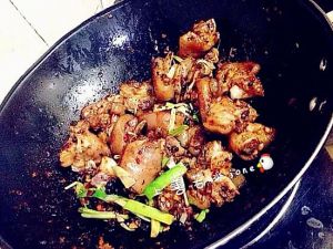 最后转中火,准备清水倒入炒好的猪蹄中焖10分钟后转大火,撒上葱段翻炒1-2分钟收汁,出锅