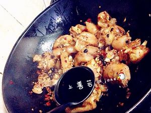 蒜、姜、干辣椒切末,一块桂皮,两颗八角,几颗花椒,油入锅三分热后按上顺序将调料一一入锅,翻炒至每种调料都溢出香味!