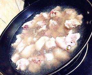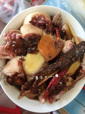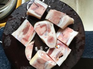 猪蹄跺小块(尽量小些方便如味),洗尽后冷水如锅焯水,同步放入一颗八角和、一块桂皮和几只干辣椒!煮开后10分钟捞出,沥水备用!