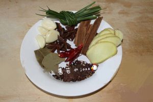 准备熟花椒若干、3-4片香叶、少许干辣椒、6片姜片、八角和桂皮若干,蒜头和葱花少许