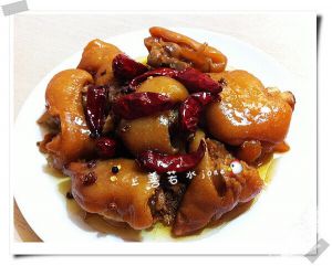 猪蹄剁成小块焯水,下油烧热,放入冰糖炒至褐色,下入葱姜炒香,加豆瓣酱、花椒、干辣椒炒。