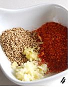 在一个耐高温的碗中放入白芝麻,蒜米,辣椒末,辣椒末最好选择颗粒大的那种