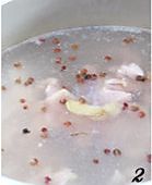 撇去浮沫; 加姜片、小葱结,几粒花椒、一点点盐; 再煮开后、加盖转小火煮10分钟(时间根据火力及鸡肉大小调整一二),关火焖15分钟;