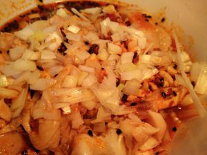 将拌料加香油和食盐再次搅拌w均匀,倒在食材上 大功告成
