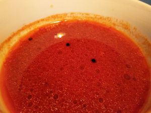 4、将热鸡汤倒入一个大盆中(5升左右),放入盐,鸡精、白糖。味道综合起来偏重为好。加入切好的大部分小米椒,待凉!可以根据喜好决定放不放点大葱。