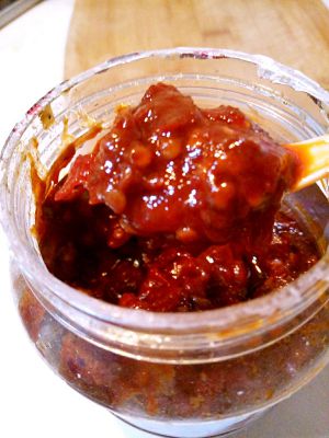 一直大火到锅里水差不多烧干,听到噼里啪啦的声音,杂酱就做好了,做杂酱不用放盐,因为豆瓣和生抽老抽就已经有咸味了