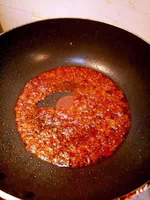 锅放油,小火把辣椒粉炒香,放葱花,豆瓣酱。
