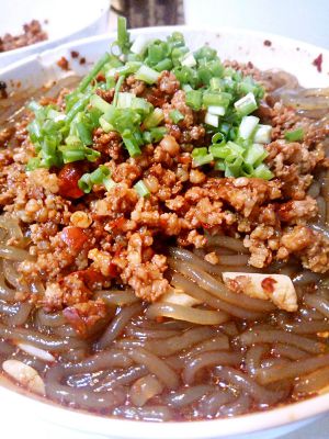 大碗装出煮好的条粉,倒入姜蒜水,适量生抽,醋,鸡精,油辣椒和花椒粉,调味到达到自己喜欢的口感,可以酸些辣些麻些,如果口味较重的话,还可以加一点白糖提鲜。最后加入做好的杂酱,洒上葱花就可以了