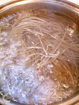 用烫过木耳的开水把红薯粉丝煮至九成熟,捞出沥水,放入香油挑拌松弛,以免粘连在一起。