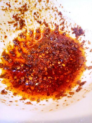 这期间可以自制辣椒油了~准备好海椒面~可以直接去超市买的~也可以自己磨~放着预备长时间储存的钵钵(也就是铁盆等)里哦~最好在辣椒面里加点白芝麻,很香哦!